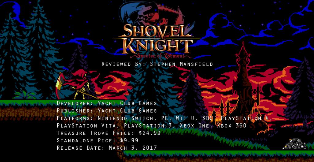 Shovel Knight: Specter of Torment is the third of four Shovel Knight campaigns following the original 2014 game (now called Shovel of Hope) and 2015’s Plague of Shadows. Originally promised as a free DLC campaign as part of a stretch goal, Specter of Torment is now being sold standalone or as part of the now more expensive Shovel Knight: Treasure Trove. Common sense dictates that people would be mad about a change like this, especially considering it’s breaking a kickstarter promise. Therefore, it’s a testament to the campaign’s quality that Yacht Club Games has received nothing but praise from the community at large. And this praise is totally justified. Shovel Knight: Specter of Torment is just that good.
